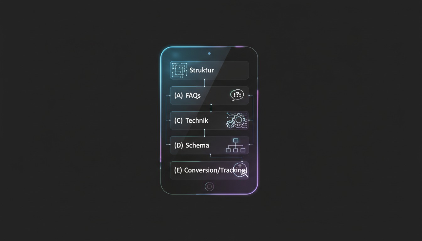 In der Praxis heißt das: bessere Seitenstruktur, klare Service-Seiten, FAQs pro Thema, saubere Technik (Canonicals, Indexierung), passende Strukturdaten (Schema) und ein messbares Conversion-Setup.
